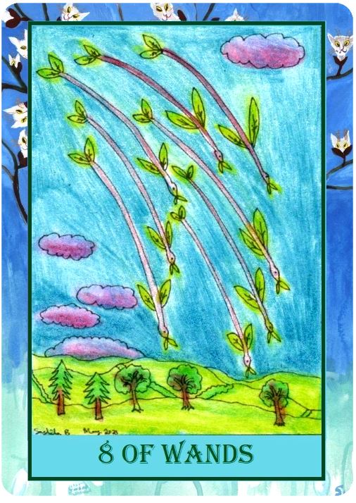 The Kitty Willows Tarot comes partly from my Hinted Tarot colouring book and partly from my 2013 painting "The Darling Buds of February" in which little cat heads grow out of the bare branches of willow trees, with snowdrops down below. These "kitty willows" provide the back design and the borders of the front of the cards. (Really I wanted to use the traditional name for these first signs of spring, but alas, feared being penalised by search engines.)